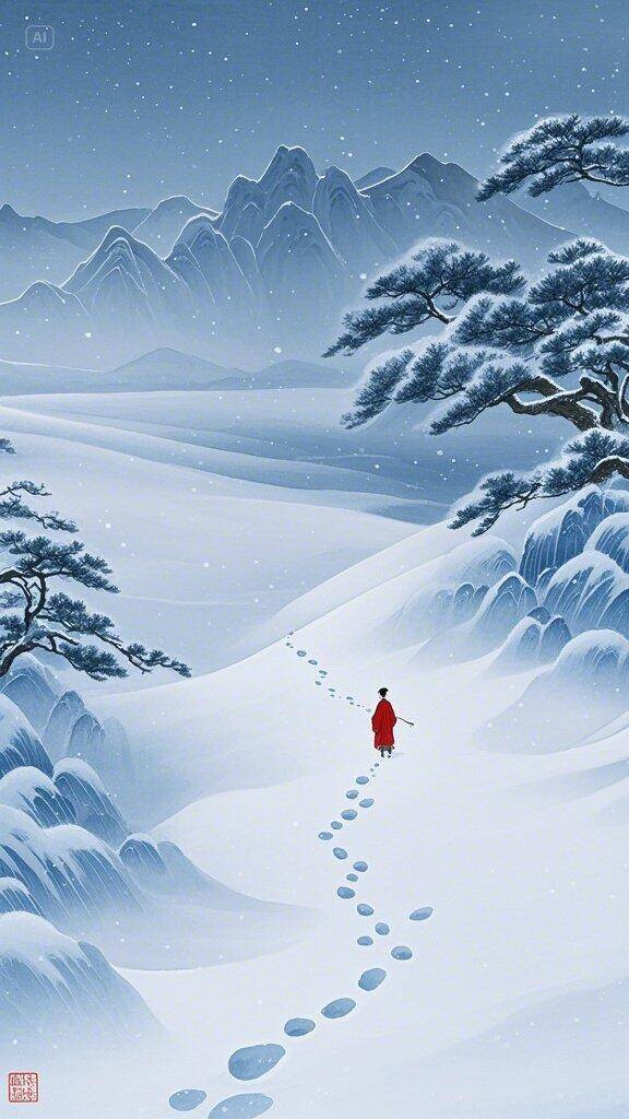 茫茫一片,茕茕独立,寂寂而行,却不觉孤单。飞雪千年,千年前的情思,是否也沿着时空里浩荡的风,随着这飘舞的雪绵亘至今呢?